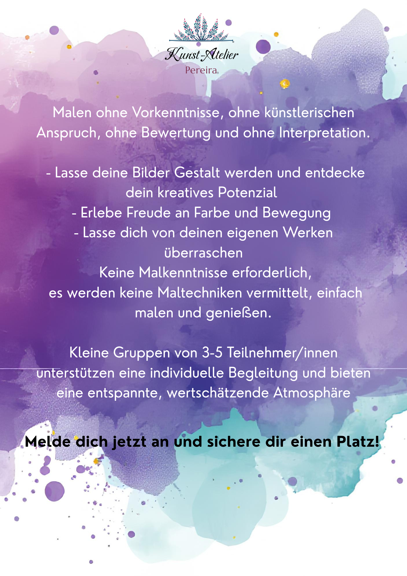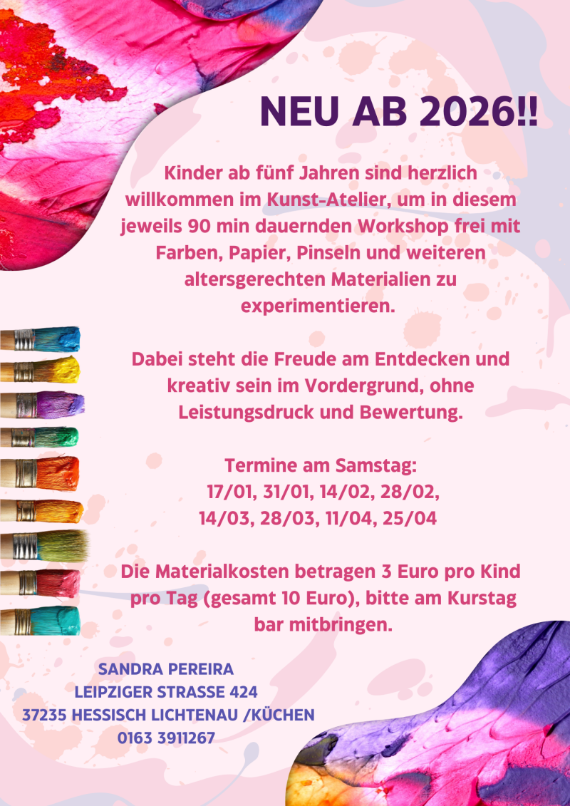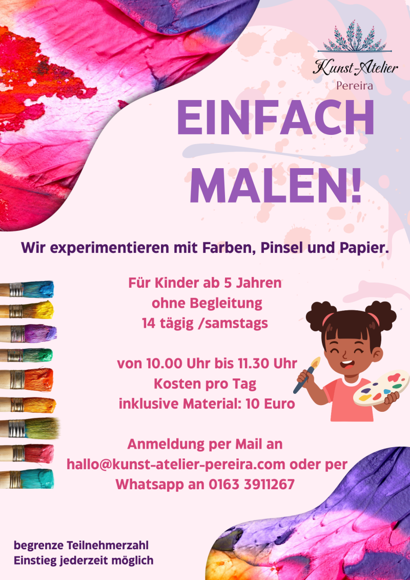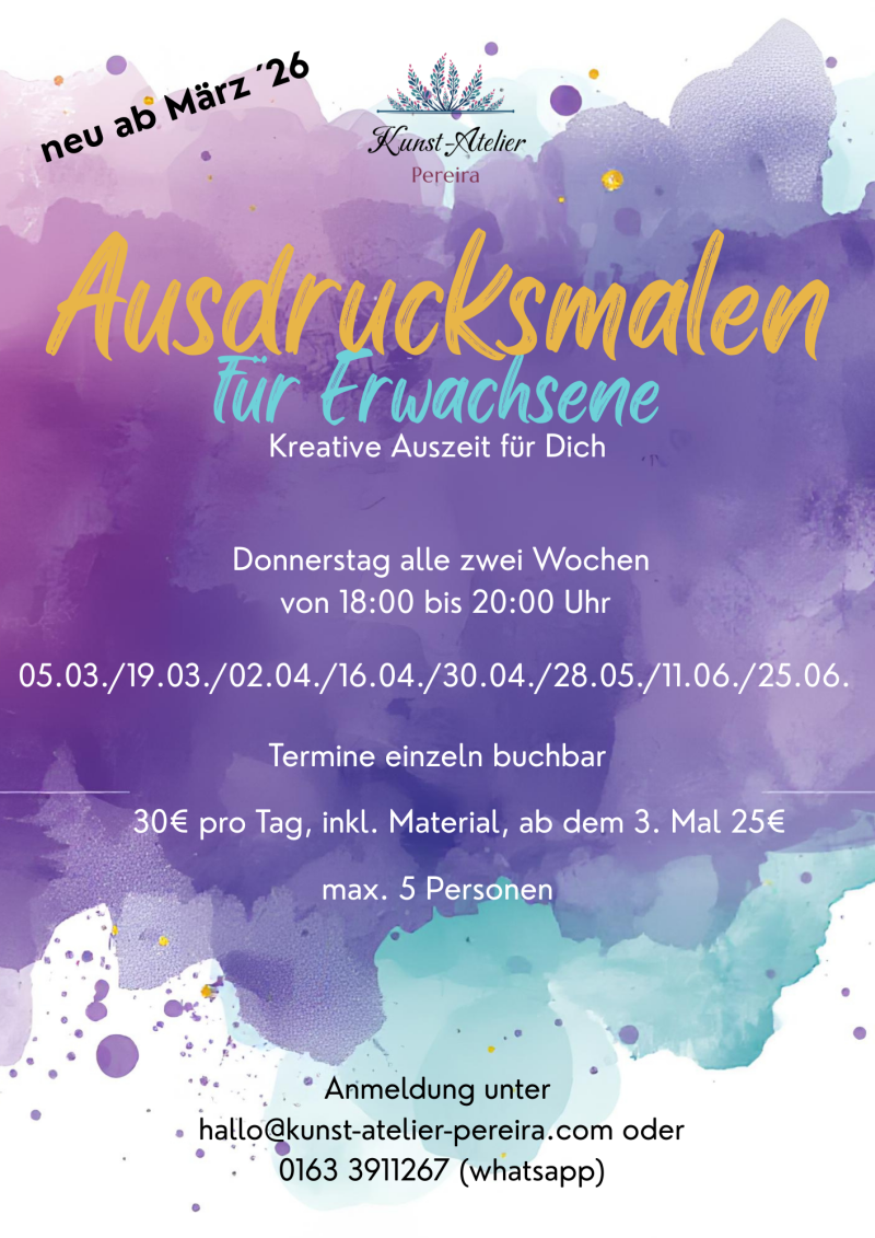 Beim Ausdrucksmalen lässt du deine Gefühle frei fließen und tauchst in eine Welt der Kreativität ein. Ohne Regeln oder Erwartungen kannst du einfach malen und dich von deinen Emotionen leiten lassen. Ein perfektes Angebot, um Stress abzubauen und neue Energie zu tanken!
